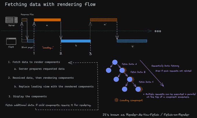 React Server Components 理解のための復習。 ”Render-As-You-Fetch”, "Fetch-on-Render" と呼ばれるパターンです。 コンポーネントで必要なデータを随時取得していくので、データ取得が逐次的になりやすいですね。並列化は実装者次第。 不要なJSXが初回リクエスト時に取得済みな事もポイント。